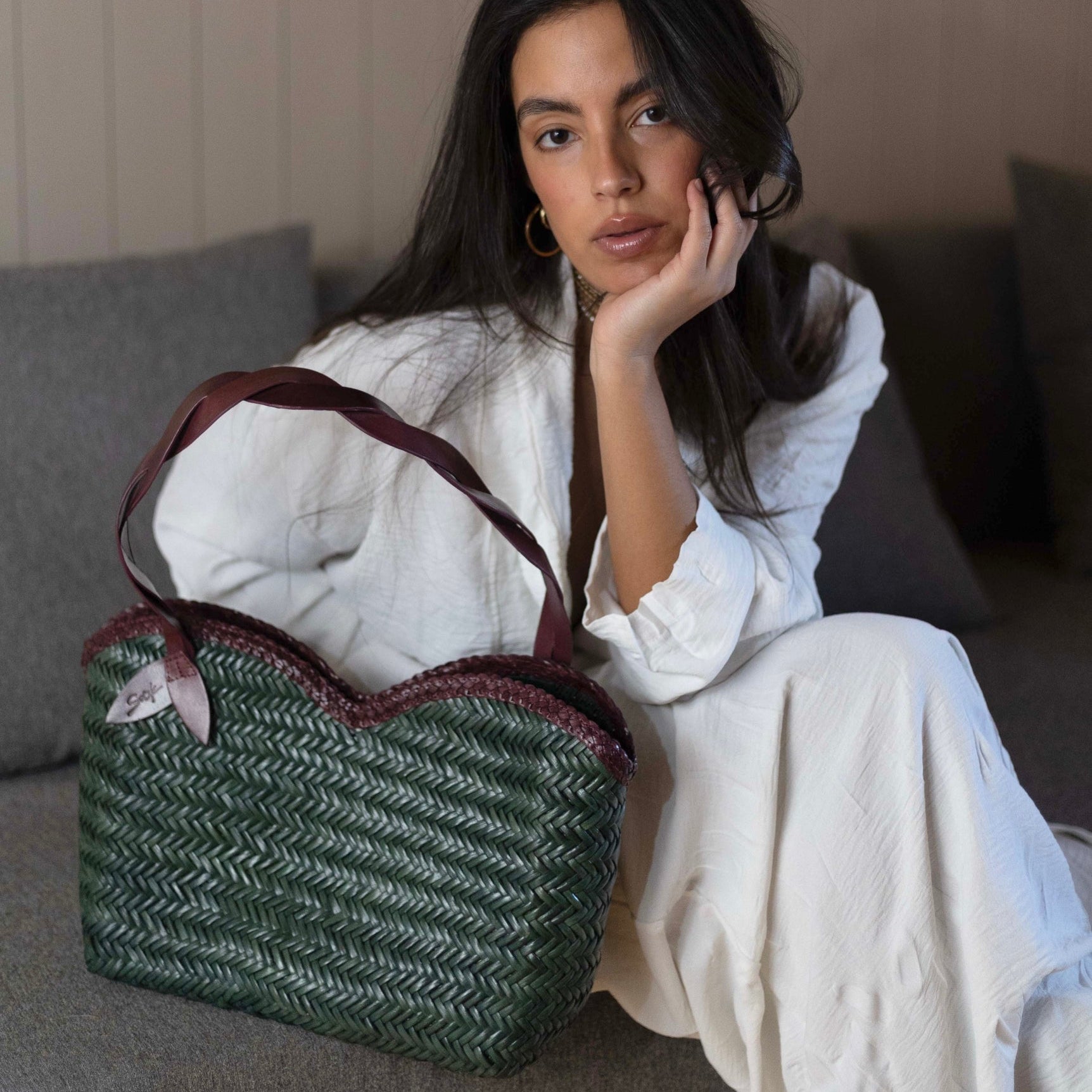Bolso trenzado de piel hecho en India por artesanos especializados. Fabricado con cuero de vaca curtido con vegetales.
