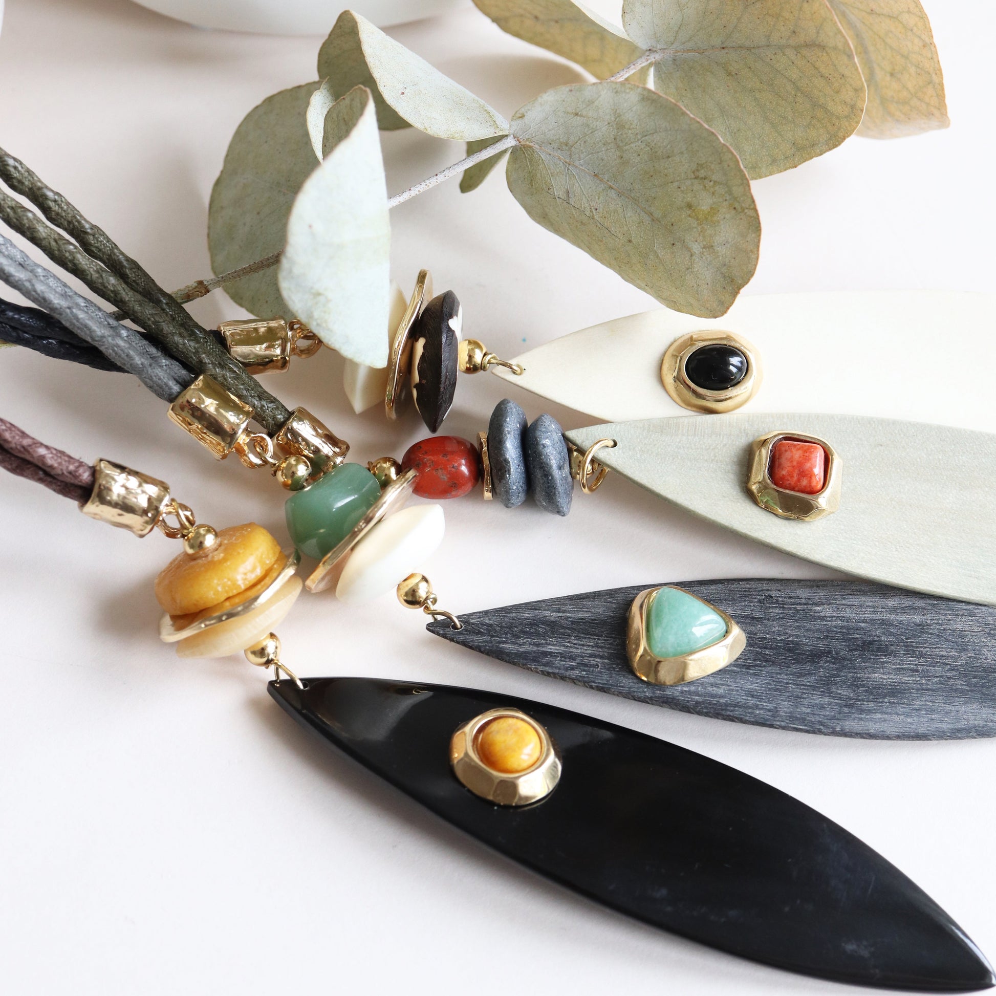 El cuerno de búfalo aporta una textura única y robusta, mientras que la madera de acacia enriquece con su profundidad sostenible; la iridescencia de la madreperla y el encanto distintivo de exclusivos materiales completan esta colección, acompañadas de piedras naturales que añaden un toque colorido y orgánico.