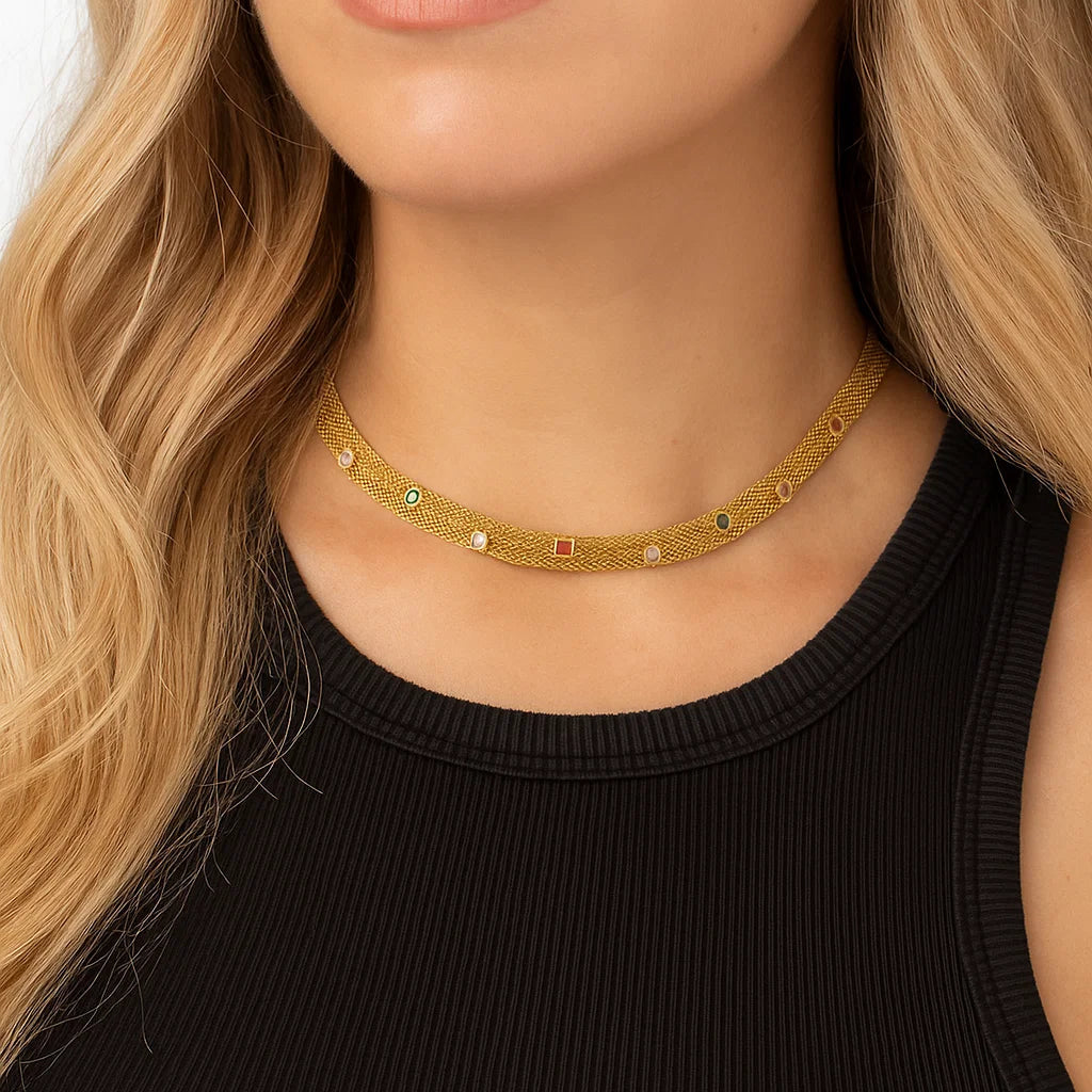 Esta gargantilla nos recuerda a esas que puso de moda una famosa firma de alta joyería. Malla dorada, cuajada de piedras de colores. Si estás pensando en renovar este complemento, ojo con esta pieza, nos da en la nariz que puede volverse de lo más viral.