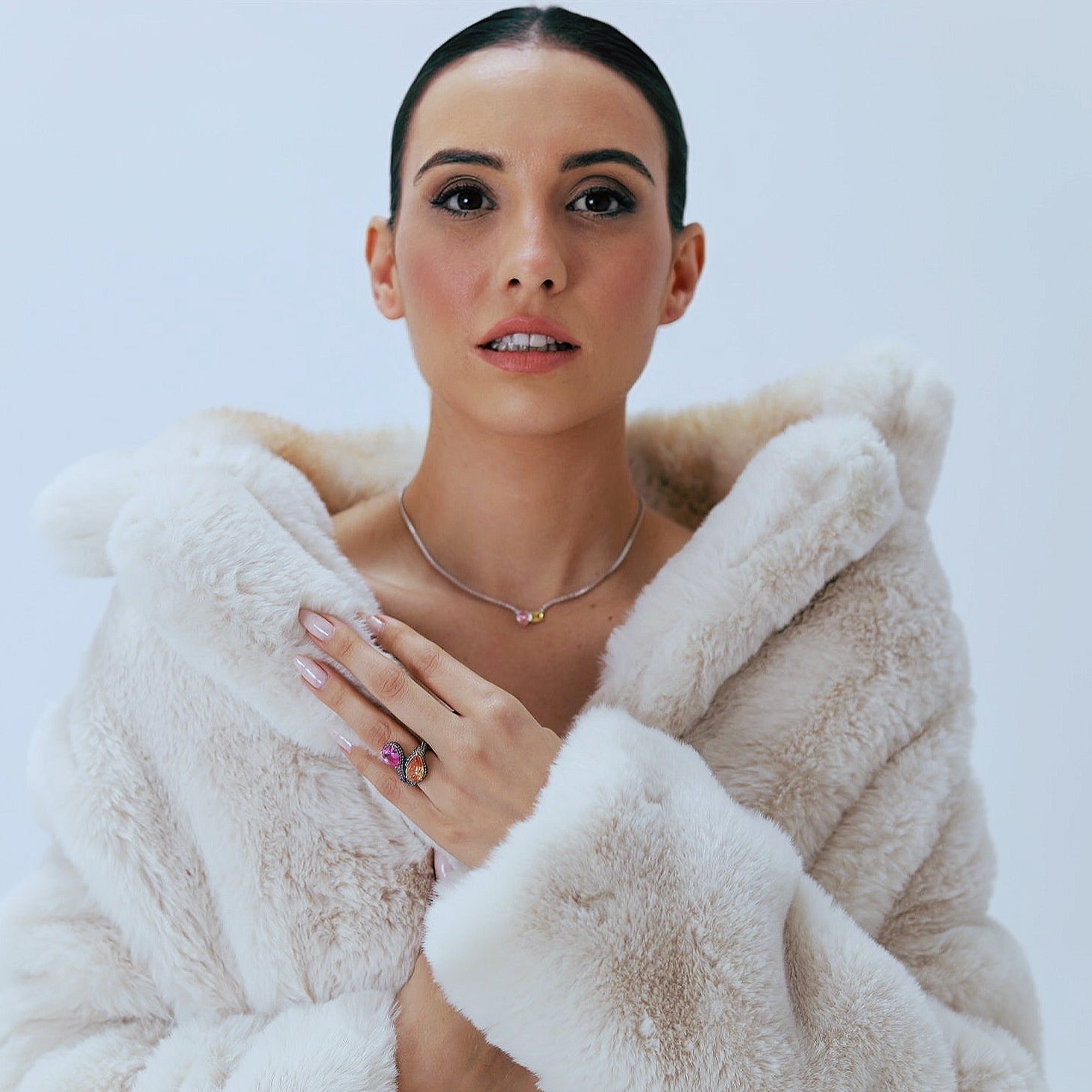 Realizado en plata de primera ley 925 milésimas, acabado con un baño de rodio en blanco. En el centro, encontramos dos piedras: una en talla pera en tonalidad rosa y otra en talla rectangular en tonalidad morganita. En los laterales, nos encontramos con piedras en talla circular de 2 milímetros, como si se tratara de un collar Rivière.